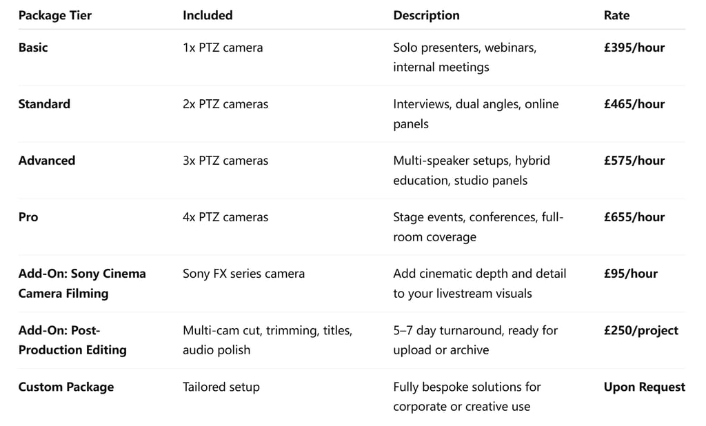 All packages include setup, rehearsal time, tech operation, and live switching.