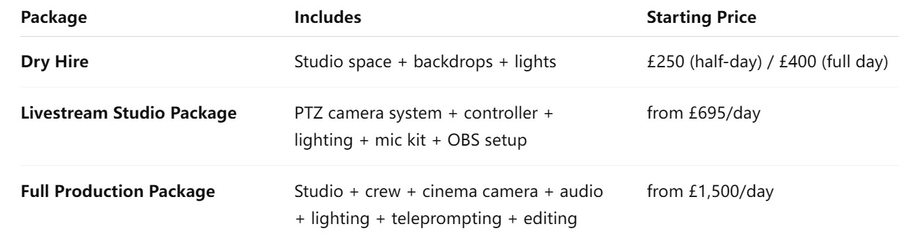 A versatile production space combining multi-camera livestream capabilities with a dedicated photography zone.
