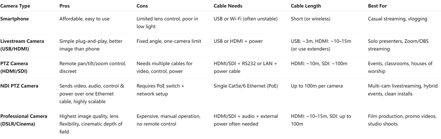 How do smartphone cameras, livestream cameras, PTZ cameras, and professional cameras compare?
