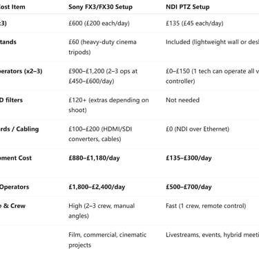 Below is a 3-Camera Setup Livestream Comparison: Sony Cinema Cameras vs NDI PTZ Cameras (Rental + Operator Cost)