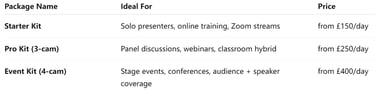 Rental kits are configured with cameras, lighting, connectivity and any accessories you select. Everything you need is supplied ready for setup and use.